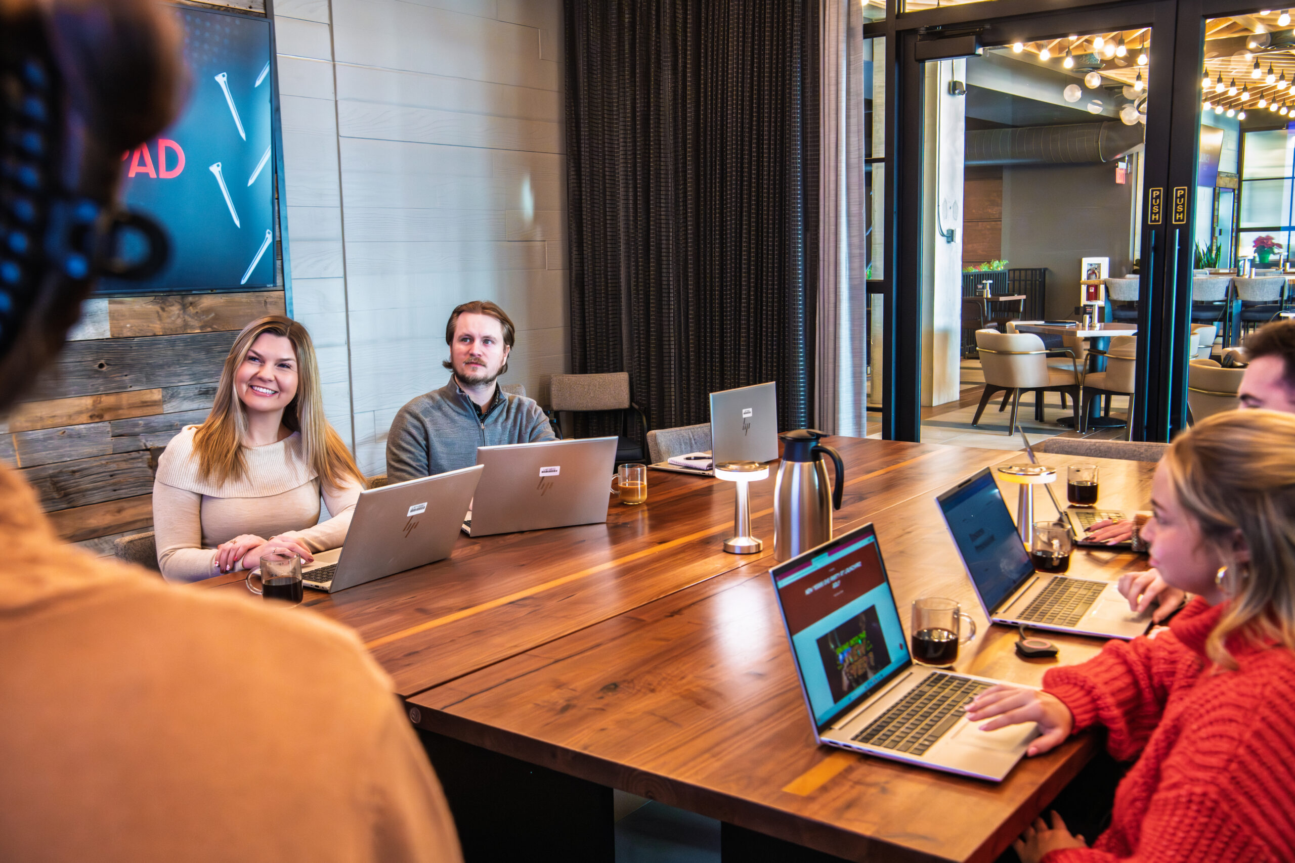 First Floor Dining Room: For larger groups of up to 50 people, our first floor dining room offers flexible seating arrangements—choose dining tables or theater-style seating—with 12 different TVs to project presentations throughout the space.